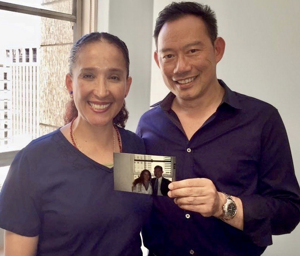 Dr. Tan and Nancy holding a photo from 1997 when they first opened the office located at 100 Bush!