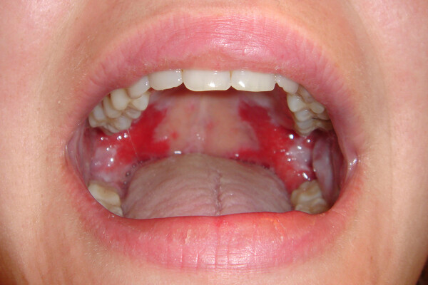 Oral thrush. If the inside of your mouth is red and you see white patches on your tongue and inner cheeks, you might have oral thrush. Wiping these patches off can leave red spots that bleed. The good news is that oral thrush is pretty harmless for most people and can be cured with antifungal medicine. However, oral thrush can be more serious for people with lower immunity, such as people experiencing cancer treatment or HIV/AIDS.