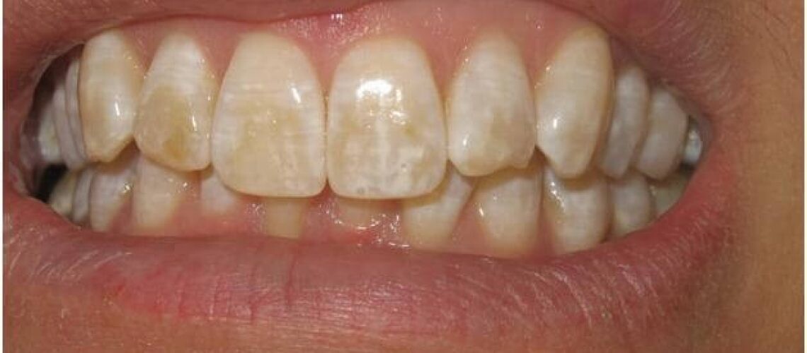 We know that fluoride is supposed to help protect our teeth from decay: but did you know that too much fluoride in the body, especially in children, discolors the tooth enamel? When you experience excessive fluoride intake, you might develop fluorosis. Permanent white lines or streaks often indicate mild fluorosis, whereas brown, gray, or black patches and pits, typically on top of an irregular tooth surface, represent more severe fluorosis. Although the teeth may look damaged, fluorosis is, in fact, only a cosmetic condition. Unless another condition has caused decay, they're perfectly healthy.