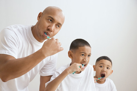 Children learn by watching and copying. If you want to demonstrate the correct way to brush your children’s teeth, brush your own teeth at the same time. Show them how to brush each surface, including the backs of teeth and molars. It is also a good idea to get your children to brush your own teeth; they will find this really amusing, although expect to have toothpaste around your mouth afterwards. You should supervise them brushing their teeth until they can rinse out their mouths and spit independently. This is normally between 6 and 7 years of age.