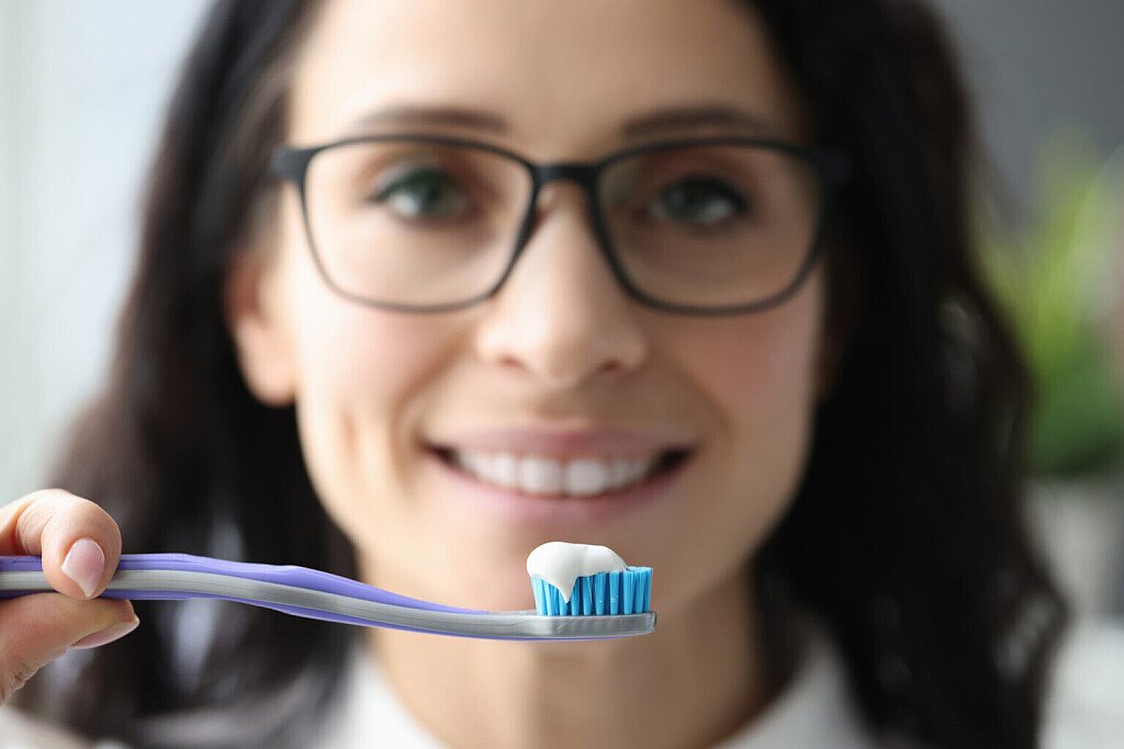 Aim for a pea sized amount – about 0.3 grams – of fluoride toothpaste for adults. Foam and bubbles do not drive plaque removal, so focus just on coating bristles not lathering the mouth. Dispense paste directly onto bristles, not tongue. Rinse away excess.